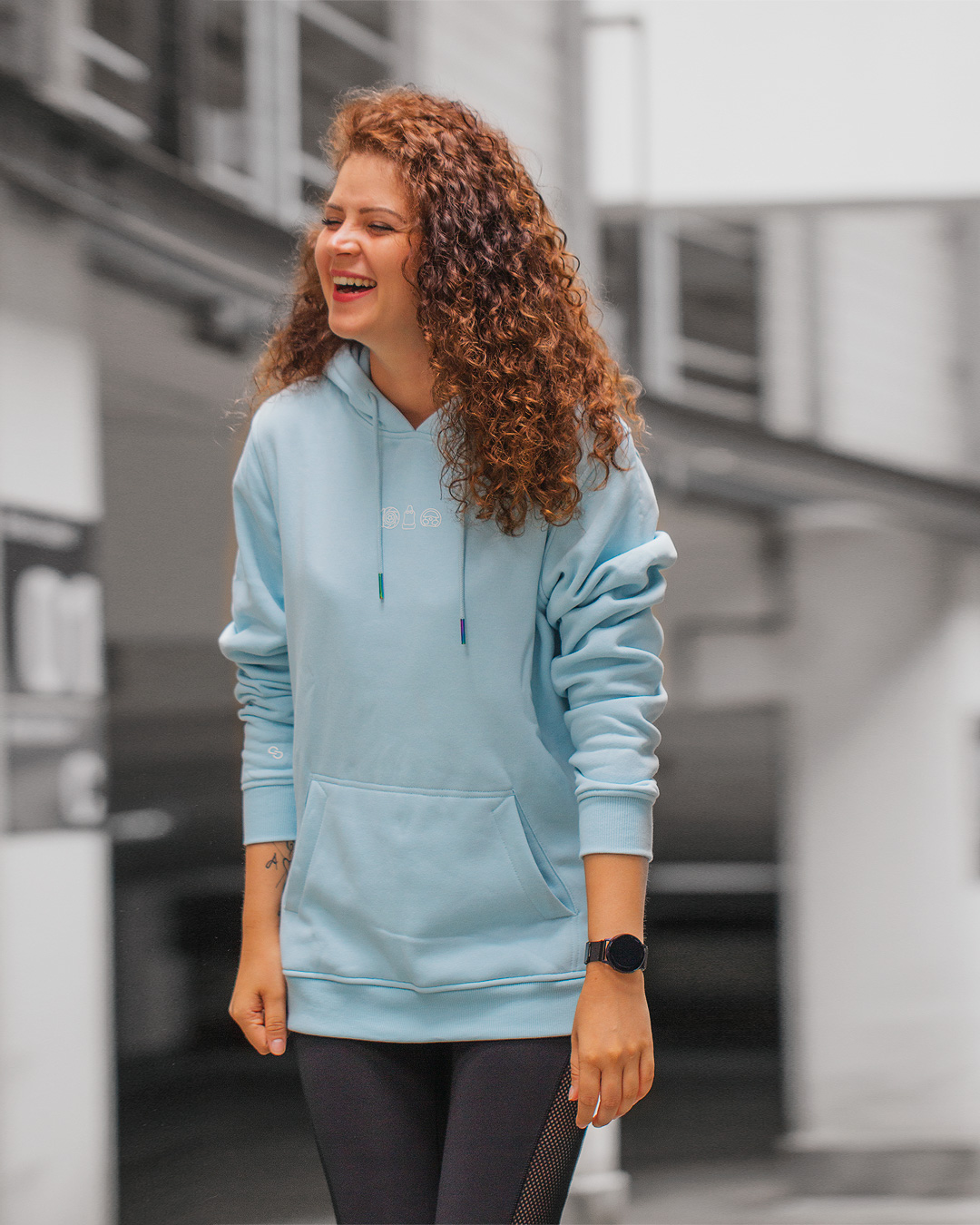 Der Hoodie besteht aus einer Mischung aus Baumwolle und Polyester, durch die hohe Qualität der verwendeten Materialien bietet er einen hohen Tragekomfort. Das Besondere am Hoodie sind die irisierenden | neochromen Metallendstücken an den Kordeln und das flauschige Innenleben.