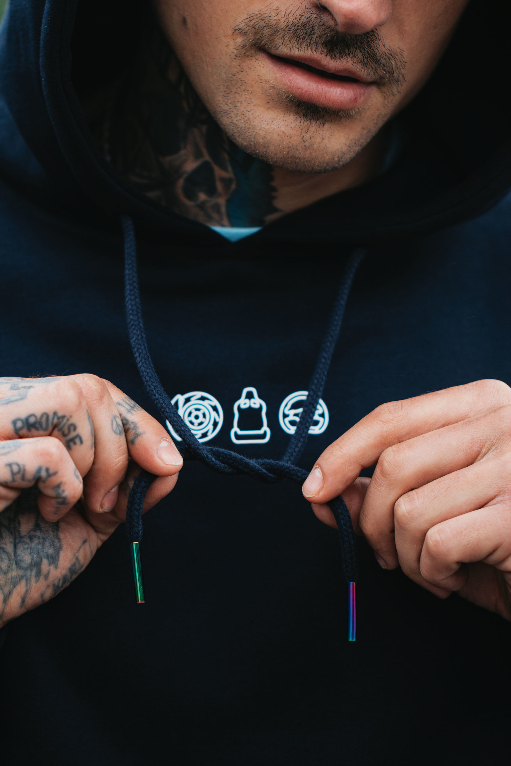 Der Hoodie besteht aus einer Mischung aus Baumwolle und Polyester, durch die hohe Qualität der verwendeten Materialien bietet er einen hohen Tragekomfort. Das Besondere am Hoodie sind die irisierenden (neochromen) Metallendstücken an den Kordeln und das flauschige Innenleben.